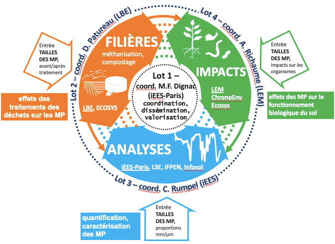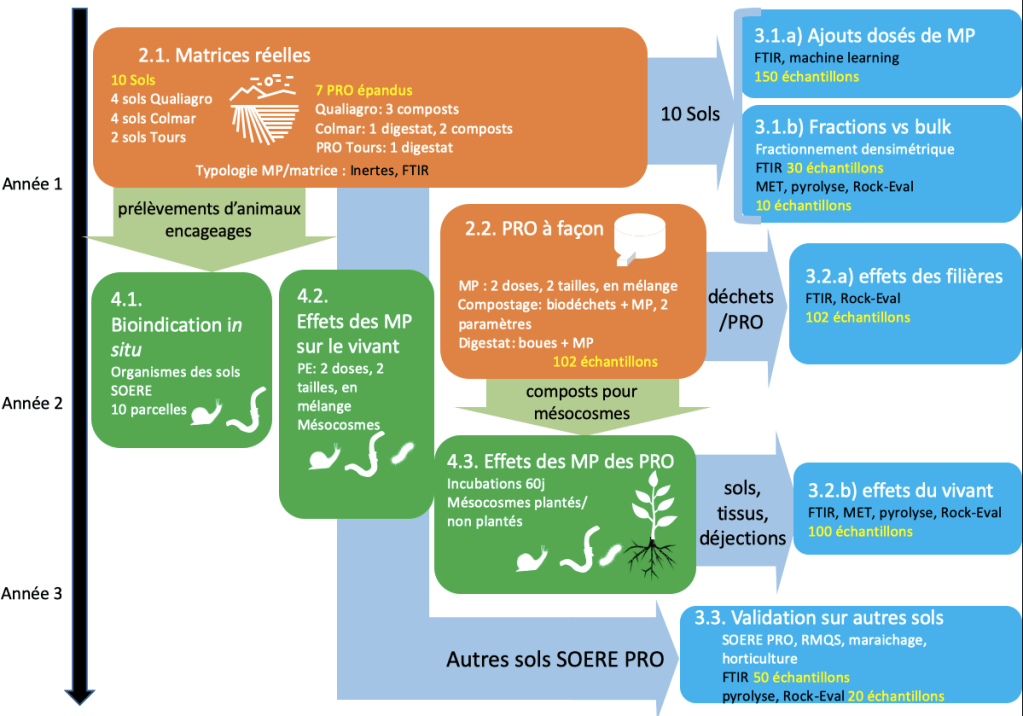 L’objectif du projet Plastisol est de développer des indicateurs de la présence de MP dans les sols en considérant à la fois leur provenance et les transformations des MP en amont mais aussi leurs impacts sur la vie du sol. Pour développer des méthodes de détection pertinentes, des MP seront suivis dans les procédés de traitement des PRO jusqu’aux sols, où leurs impacts sur les végétaux, les organismes vivants et les microorganismes impliqués dans des fonctions essentielles pour la qualité et la santé des sols seront évalués.