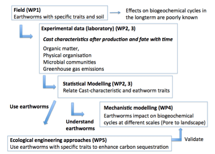The general objective of the project is to better apprehend and predict the effect of earthworms on biogeochemical cycling and soil organic carbon (SOC) dynamics and their potential for ecological engineering in agricultural and horticultural applications.