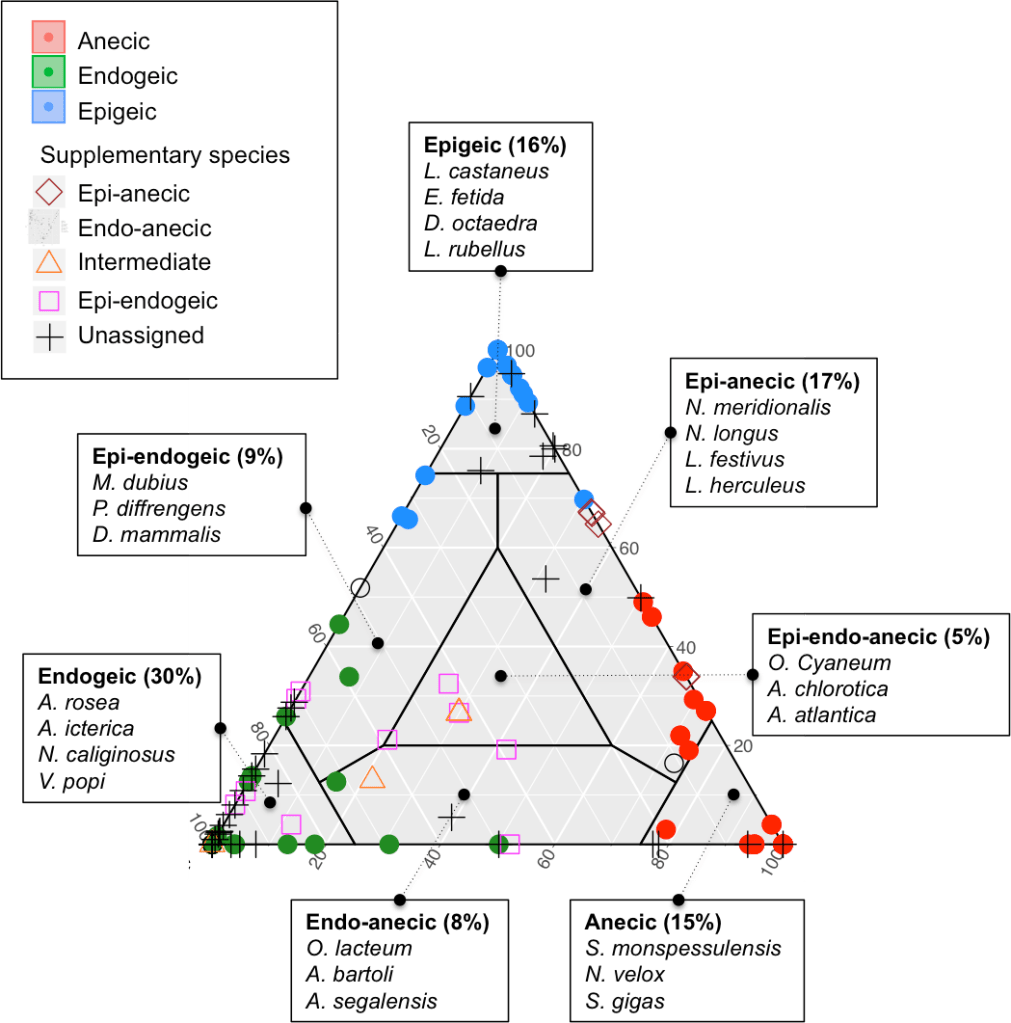 In general, earthworm species are classified thanks to the pioneering work of Bouché (1977) into three ecological groups (anecic, endogeic and epigeic species). However, there is overlap in group characteristics and recent research shows that to take into account the whole earthworm functional diversity, species traits have to be identified (Bottinelli and Capowiez, 2021).
